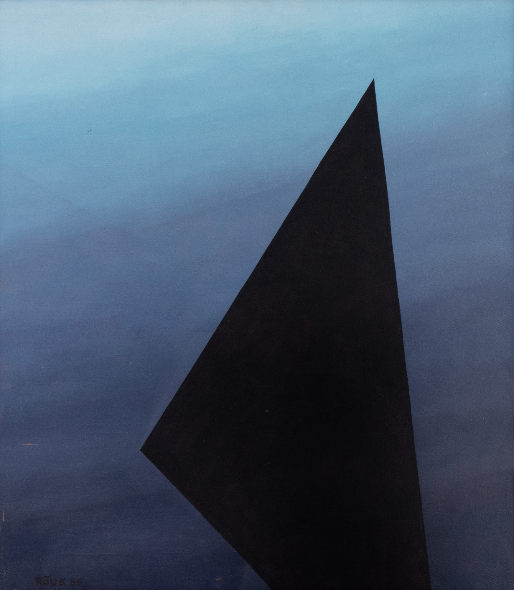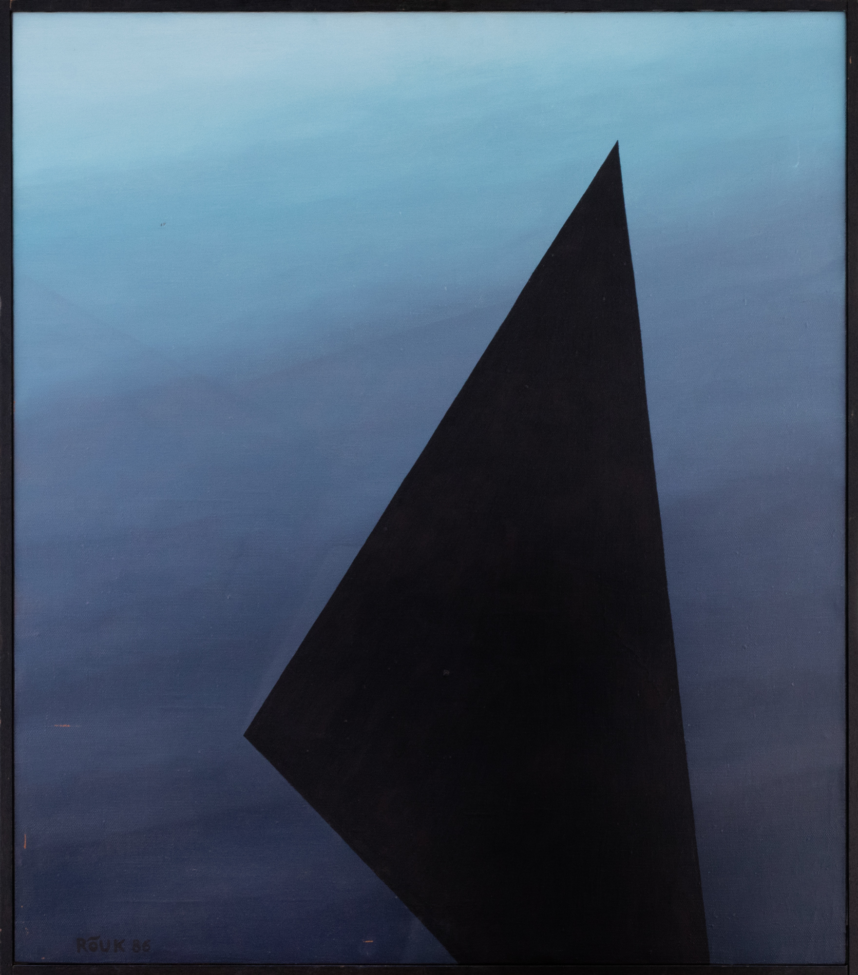 Kuigi A. Rõugu viimaste tööde hulgas on nimetusi “Tasakaal” ja “Kooskõla”, ei saa tema nüüdisloomingut tervikuna pidada harmooniliseks, tasakaalustatuks ja vaikelusiseseks. Kunstniku tööd on valdavalt dramaatilised, mida maalidel väljendavad taevaid meenutav maaliline avarus ning sellega vastanduv teravaotsaline, kolmnurkne must kujund (sari “Avarus ja sügavus”). /…/ Käsitleksin lõputut ruumi väljendavaid “taevaid” kunstniku maalidel tema enda ideaalmaailma kujutluspildina, milles valitseb harmoonia ja kõigutamatu ideaalsus. Musta dünaamilise teravikuna liigub selles tasakaalustatud sfääris looja heitlik hing, taotledes endale kohta ja rolli selles efemeerses Jumalariigis. Must on siin otsinguteema, olles vaimse eneseleidmise sümbol. Must on tõesti sügav, nii värvusena kui teemana, väites, et A. Rõuk on teel.”