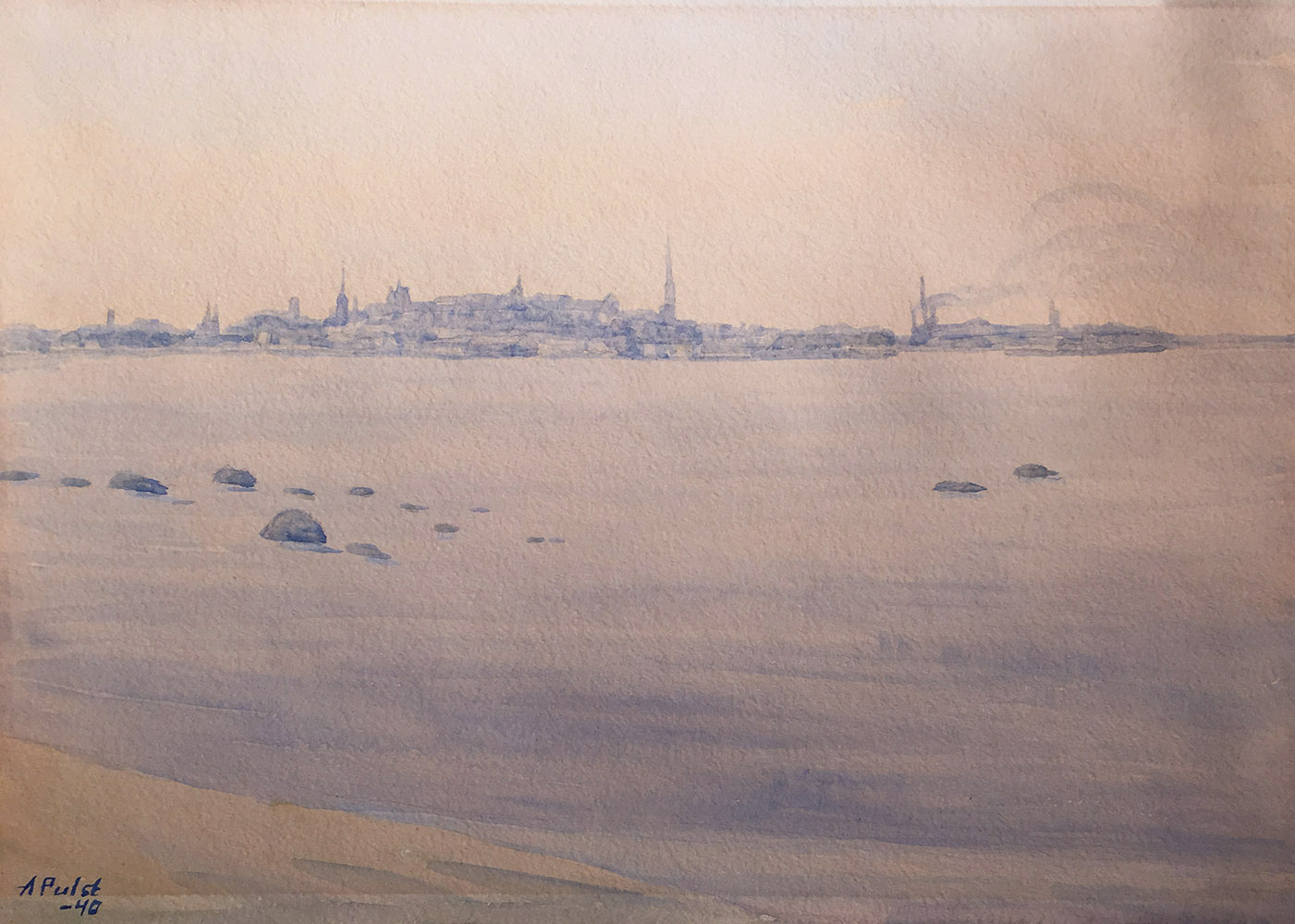August Pulst 1889–1977 Tallinna vaade merelt. 1940 Akvarell. Lm 35.8×50.0 cm Saadavus: Saadaval Teos asub galeriis. Raamita Jälgi Jaga Saadaval teoseid samalt autorilt